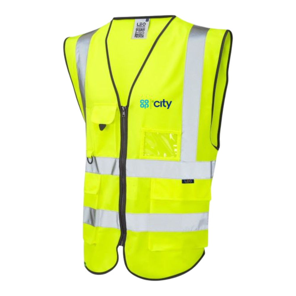 The Supervisor’s Executive Hi-Vis Waistcoat, based on the Lynton Executive Vest, combines professional visibility with sustainable design. Manufactured from EcoViz® recycled polyester, each vest is made using the equivalent of three recycled plastic bottles, reducing environmental impact without compromising quality.