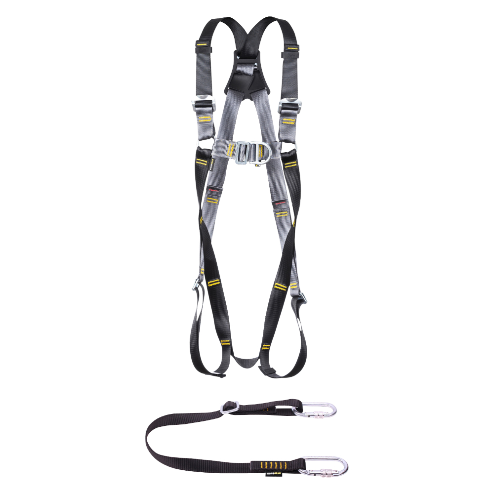 The kit includes the RGH2 two-point safety harness with front and rear D-rings, an RGL12 single-leg adjustable webbing restraint lanyard, and two RGK1 17mm steel screwgate karabiners. Together, they form a robust restraint system that prevents falls while allowing freedom of movement within the safe working zone. Built to meet the highest safety standards, this kit is ideal for maintenance, construction, and access platform use.